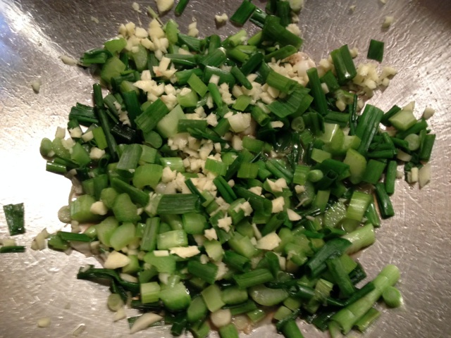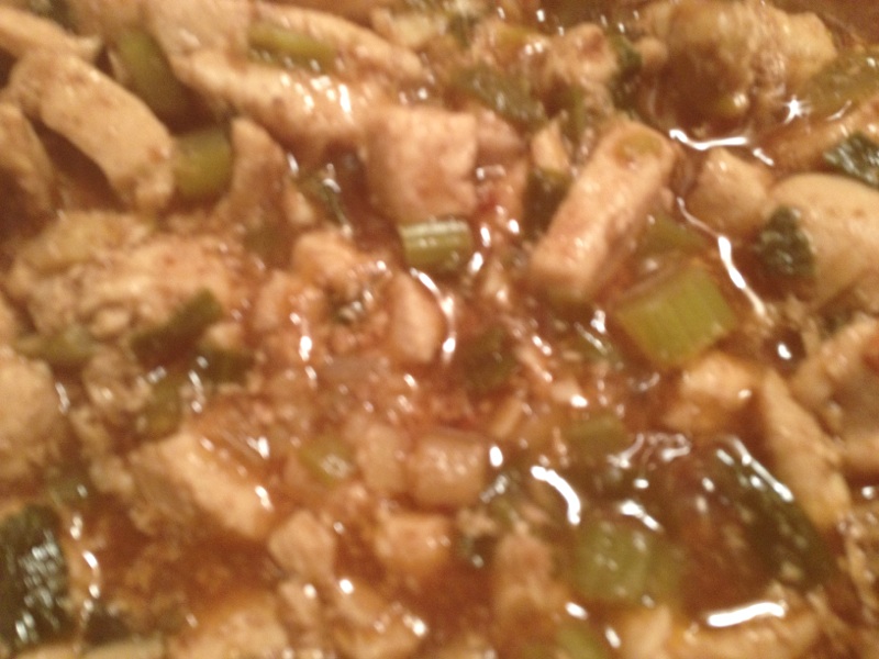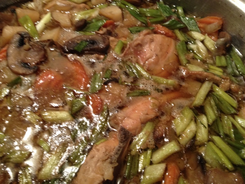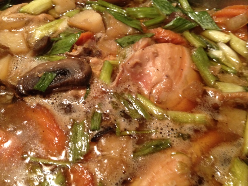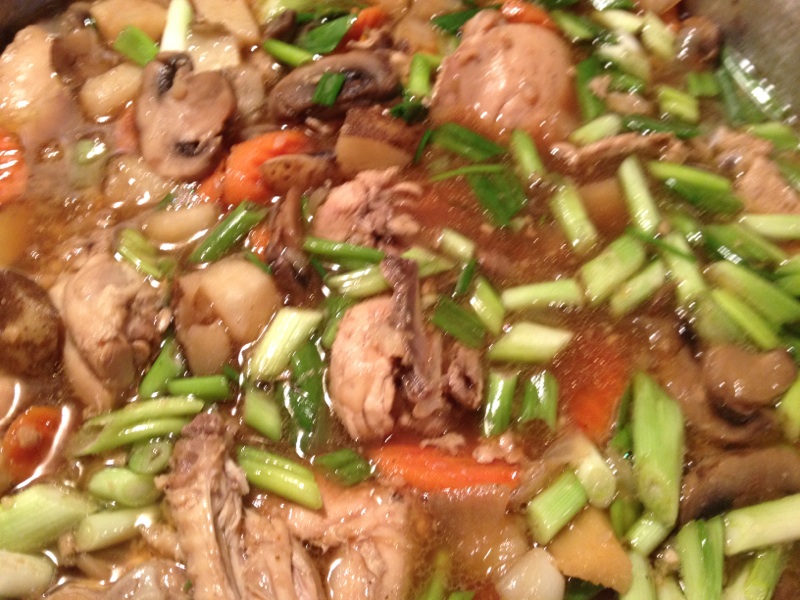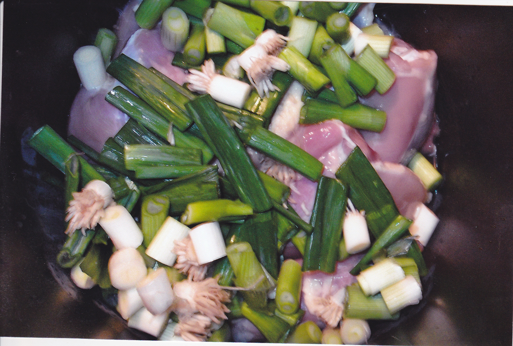 The beginning of the cooking process where I add the chicken, garlic and I did add 2 bunches of green onions.