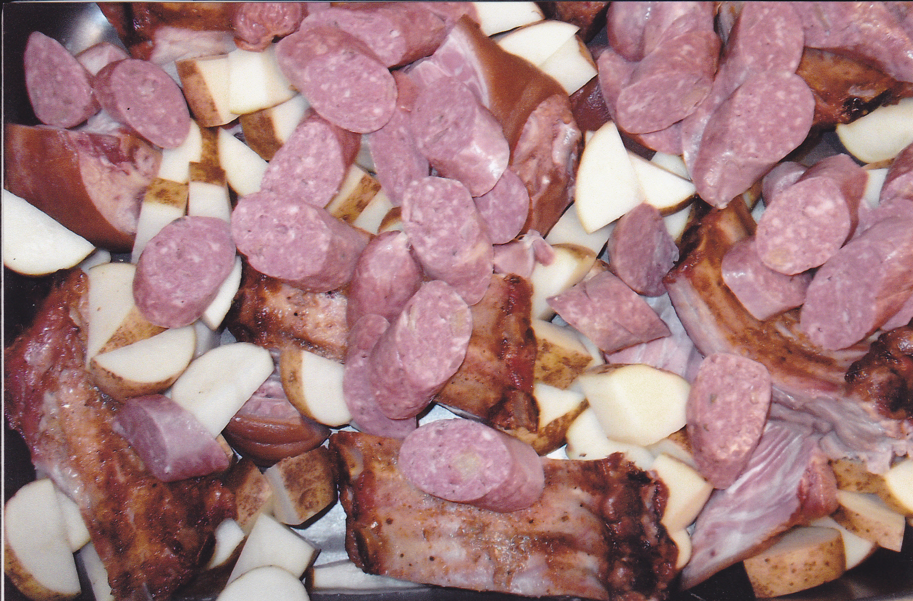 add: 2–28oz baked beans, 2–15oz cans lima beans, 2–15oz cans chile beans, 1 qt kidney beans, 2- 15oz cans butter beans, 1–10oz can tomato soup, 1–15oz can tomatoes diced with chili’s. Jim drains water from all beans but not any with sauce. Bake at 350 deg. til bubbly. You can cut the recipe in half if this batch is too large. more to come………….