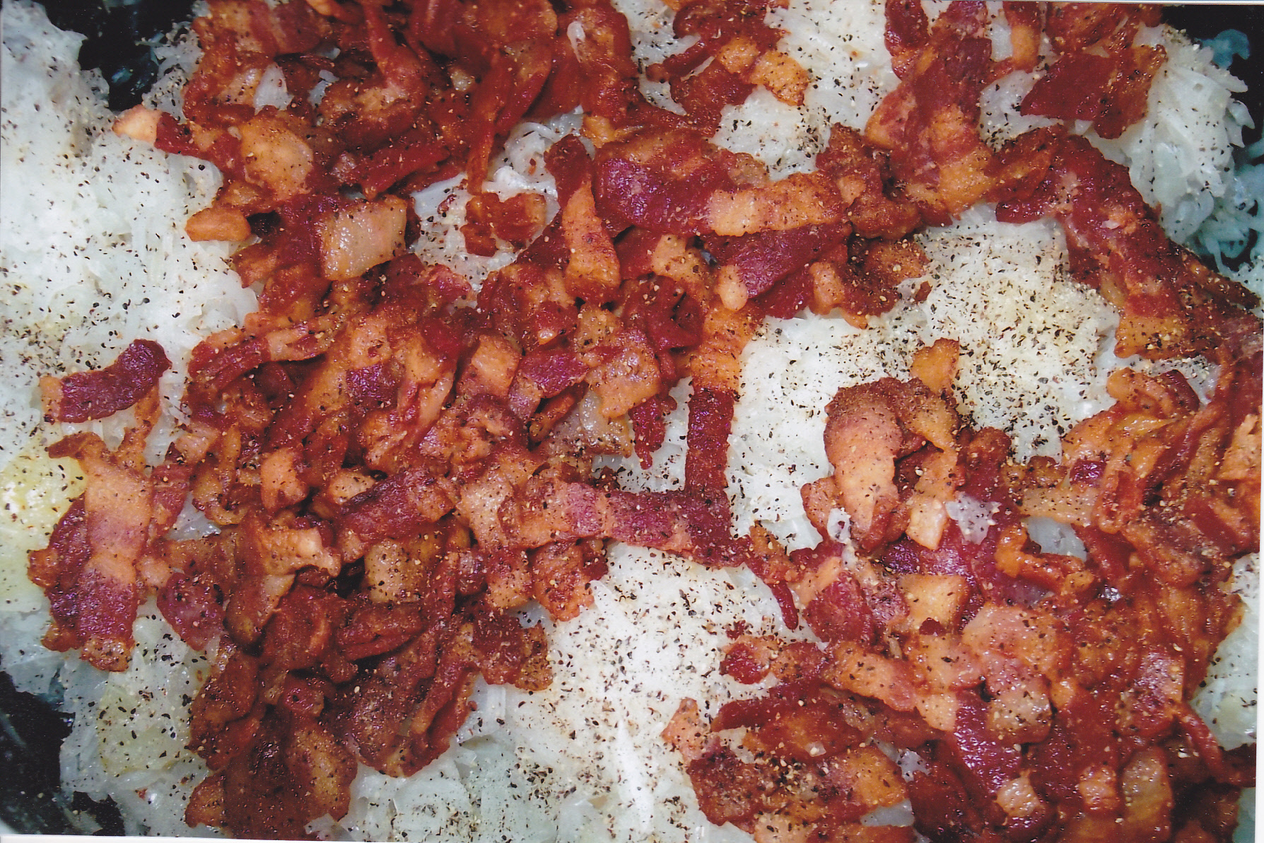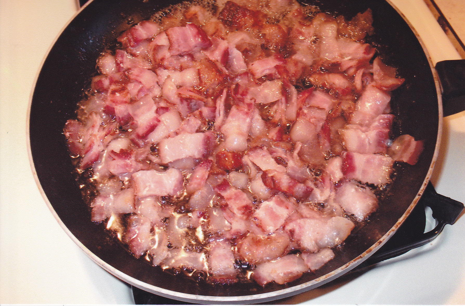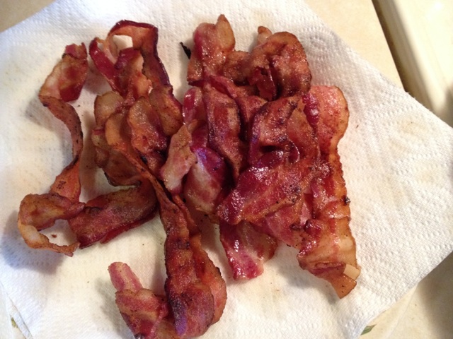 one pound of thick cut bacon, fried until crispy, drained, and chopped