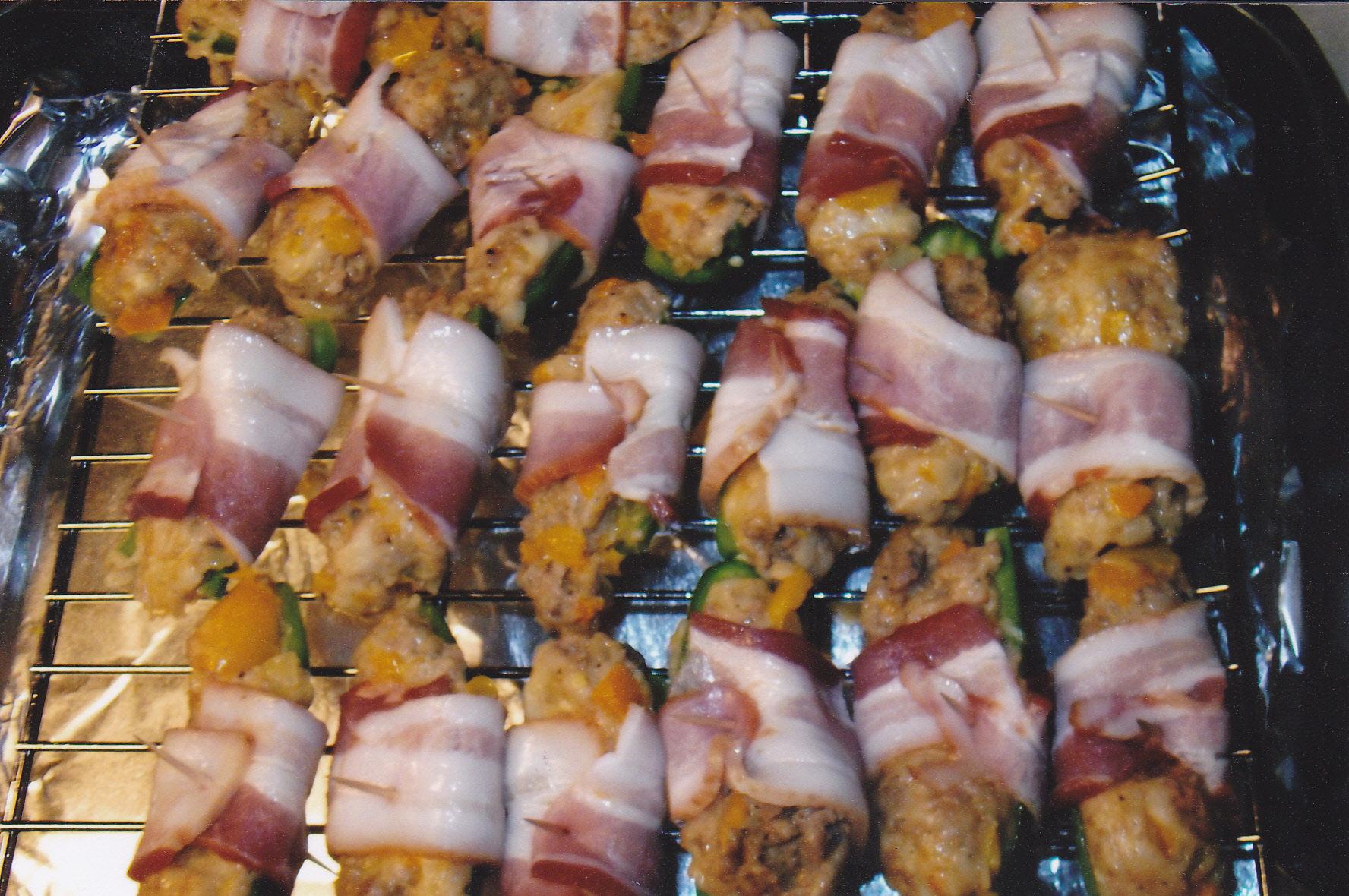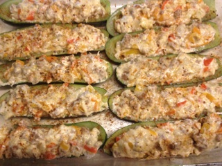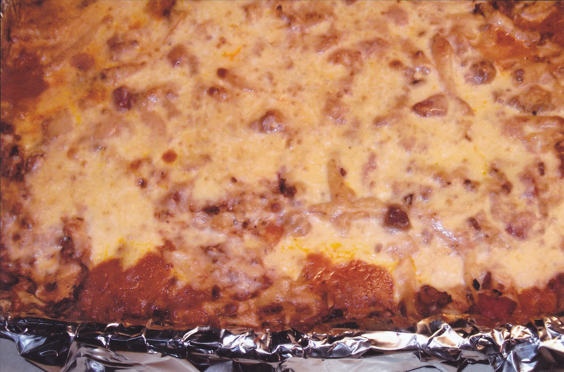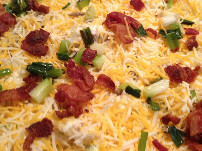 The sauce, jalapenos, cilantro, bacon green onions are placed in layers along with my homemade chili dogs with cheddar cheese.