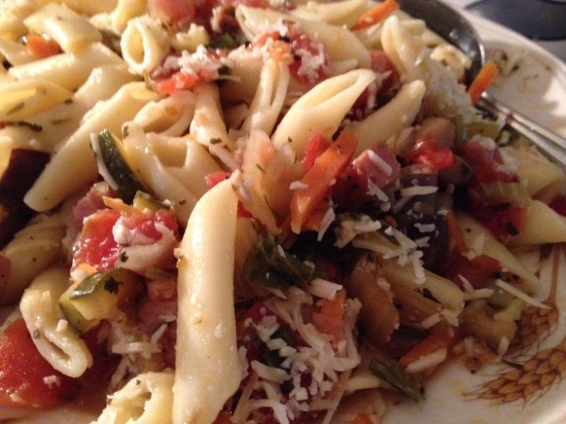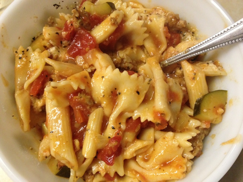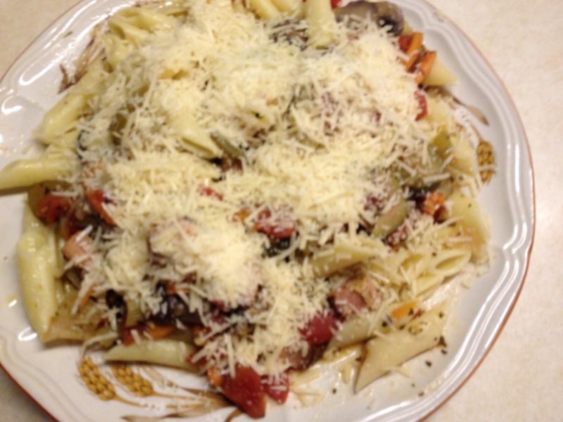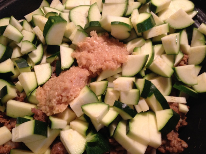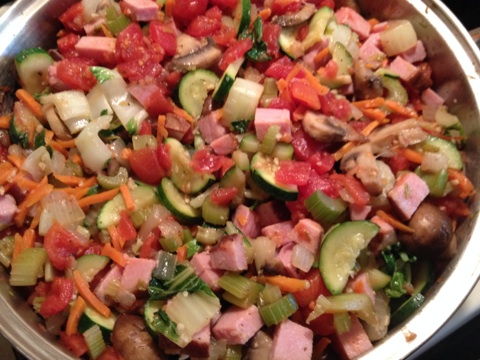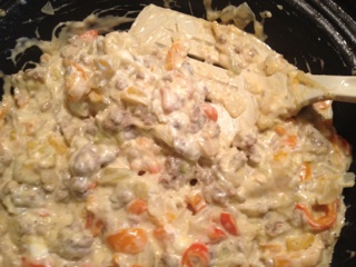 Including the veggie/sauce mix which has cooled enough to handle. Mix everything up well now.