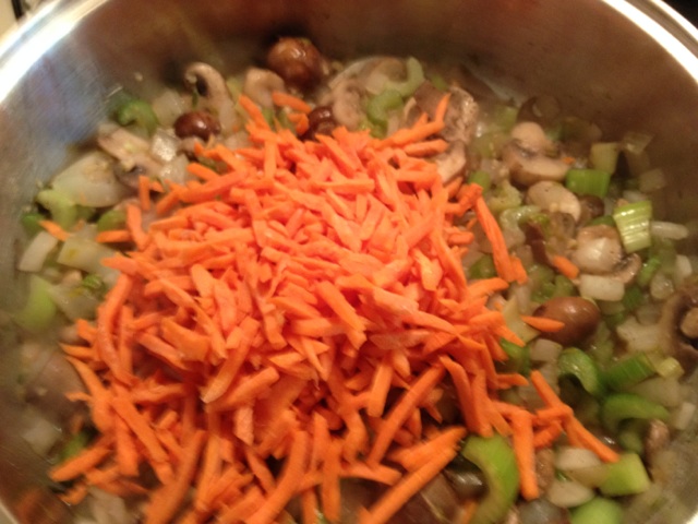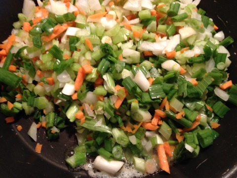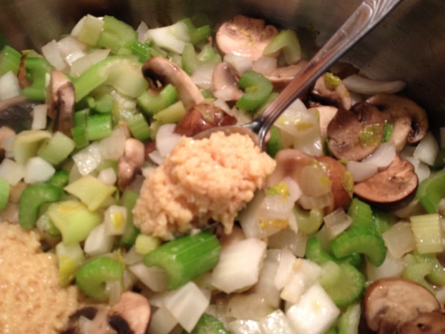 The ginger, garlic, green onion and celery is in my wok along with a little beef broth. Didn’t have veggie broth but this works well.
