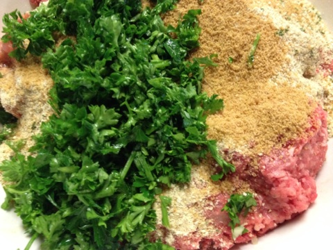 Place the ground chuck and the sausage into a large mixing bowl. As far as the sausage, you can use mild or hot, depending on your tastes. Add the slightly beaten eggs, bread crumbs, chopped parsley, rub, and sauteed vegetables to the mixing bowl and mix the meat and other ingredients together until combined.