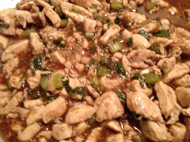 Braise ginger, garlic, celery, and onion til soft then add chicken, cook until no longer pink.