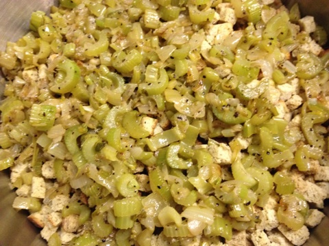 Starting to add the celery and onions to the bread cubes along with some spices.