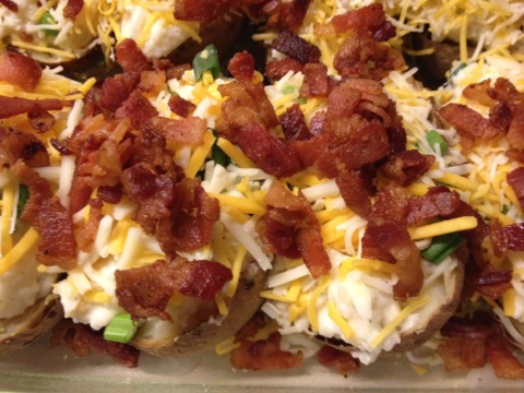 I used a aluminum pan for this. Put the tots in the pan. put the pan in the oven until done [follow directions on the package or eyeball them till done]. Mix up the bacon ranch dressing and the sour cream and spread it over the tot’s when they are done. then layer the bacon bits, green onions, jalapenos, cilantro, and chili dog sliced over the mix. Then put the cheese on top of that. Put in oven at 350 until the cheese gets bubbly and a little brown. Serve with some salsa on the side if you like.
