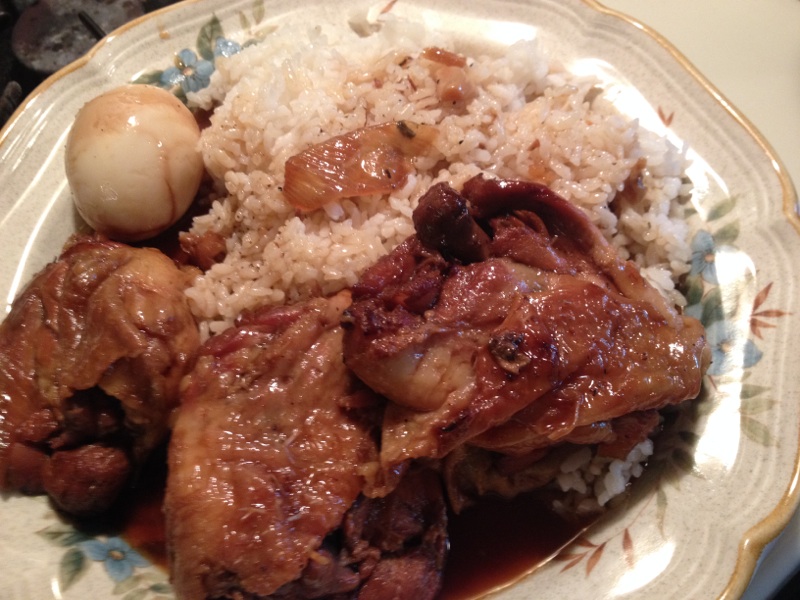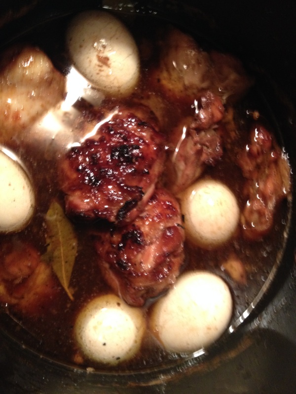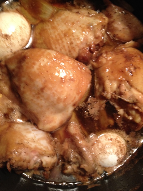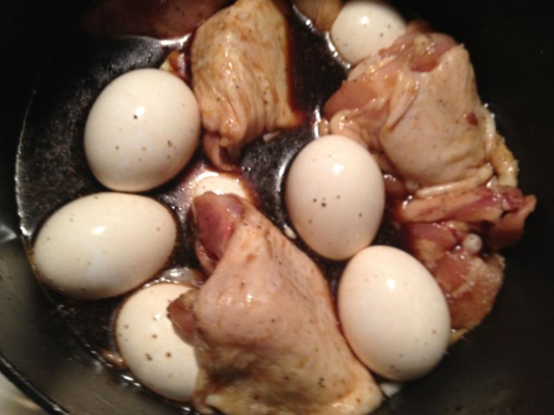 Place the chicken in a large soup pot with the listed ingredients and then slow simmer for about 20 minutes. Remove the chicken and then quickly sear both sides on the grill. That took about 15 minutes or so. I just kept turning the chicken thighs once in awhile till they got some good grill marks and color. I cracked the eggs a little so the sauce gets under the shells and put them back in the sauce. Return the chicken thighs to the pot and simmer for an additional 20 to 30 minutes or until the chicken is tender.