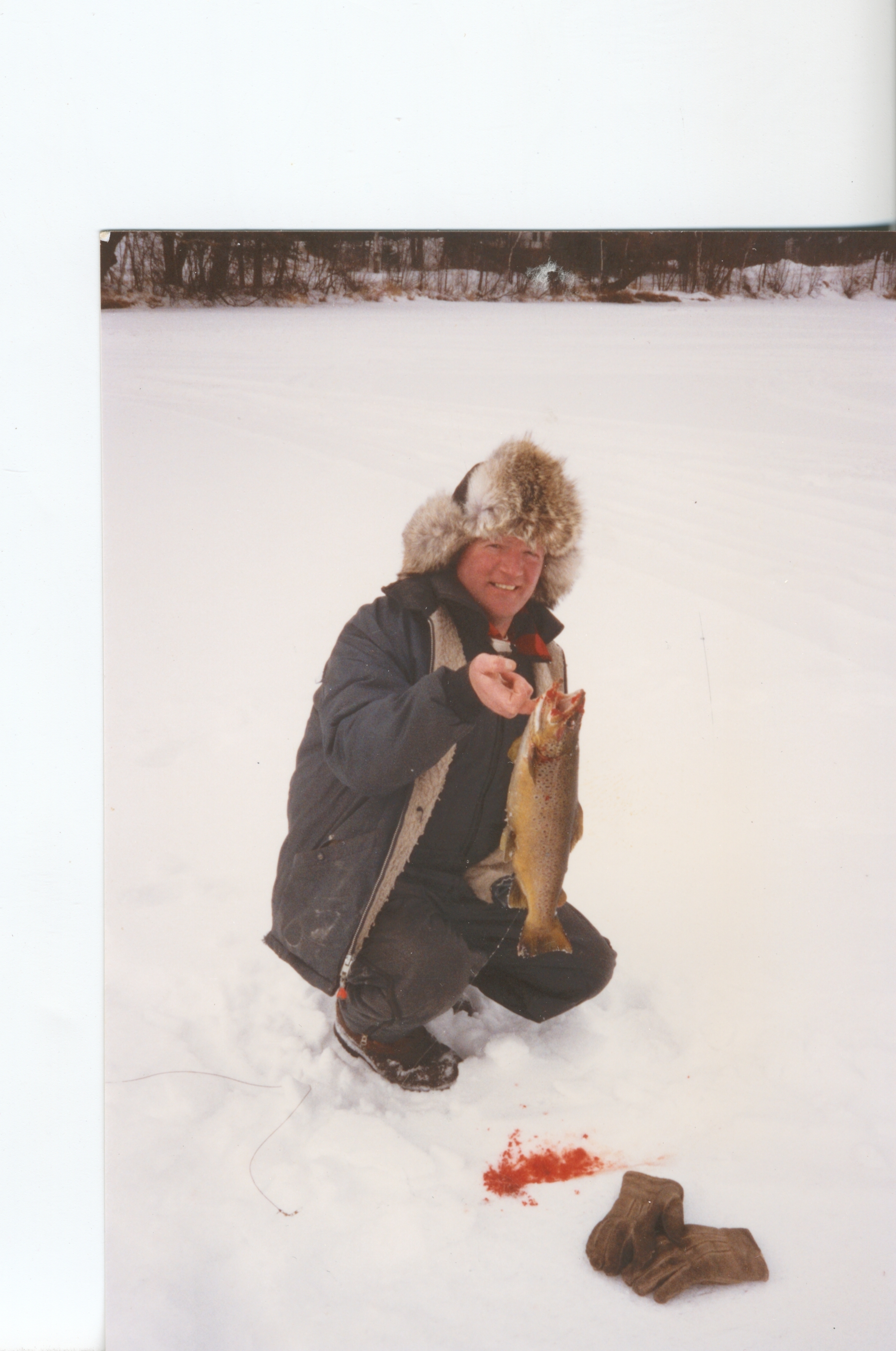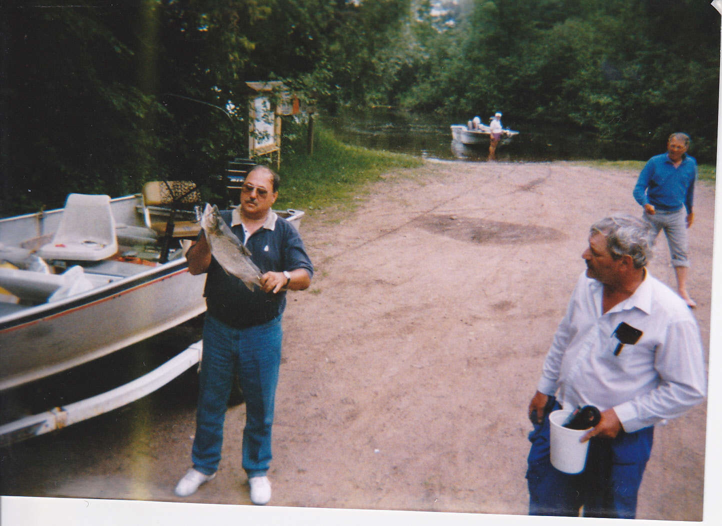 My brother on the right with his friend Emanual holding a nice 6 pound brown trout he caught vertical jigging in deeper water with jig and minnow. In the background you can see the landing before having a dock.