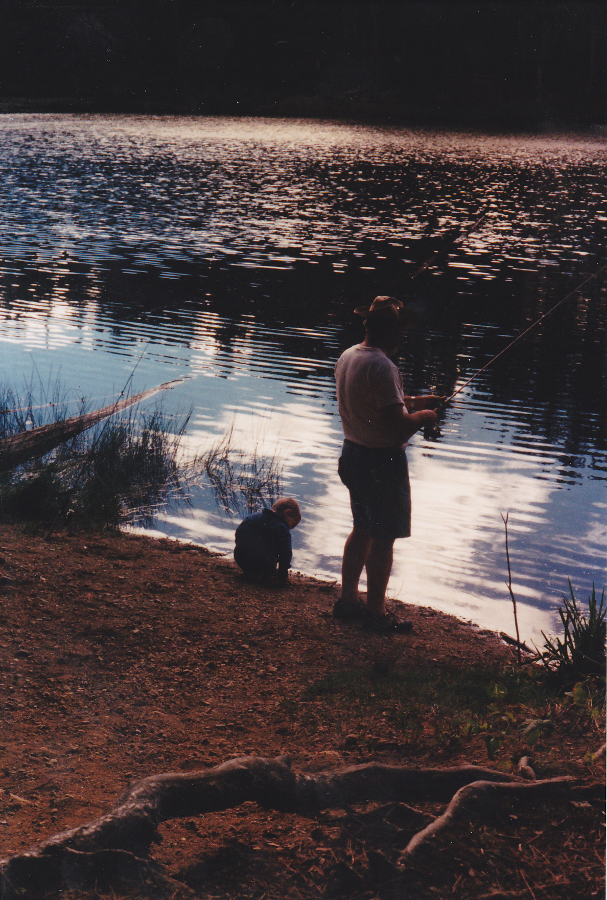 My brother and my grandson near the shore of the trout lake within the park.