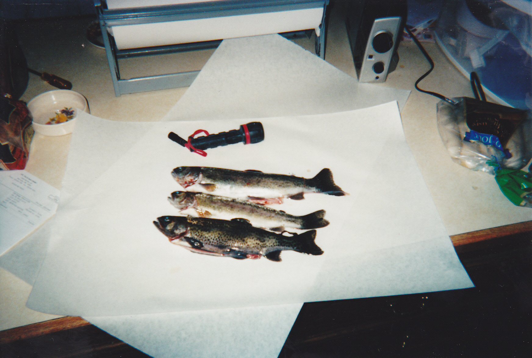 Here are three nice rainbows caught by my friend Jim. They are 12 to 15 inches long.