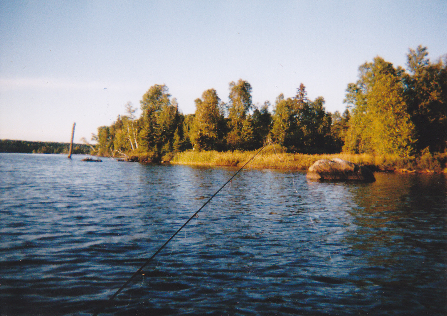 Good example of a great place to fish on Boulder. I once caught and released an 8 pound walleye by the large boulder on the right side. It was May and I had my minnow drift right to the rock when the big girl hit.