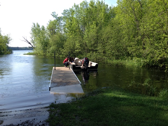 Here is a picture of the Grindstone boat landing when the water is low. We had to use my friends 14 footer this day. My 1850 Chrestliner would not have made it this day. I use what I call “the tire gauge” for my boat on the landing. When the water level is less than half way up the tire [on the DNR dock], I can land my Chrestliner. A good level is half way up the cement ramp. As you can see, it’s not even close on this trip.