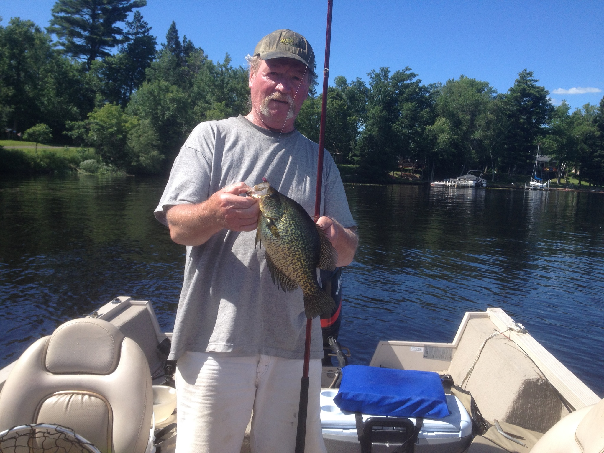Showing off a walleye we caught in the morning hours. Have my boat secured by one of the boat docks near the campsites. You can see part of the boat landing in the background.